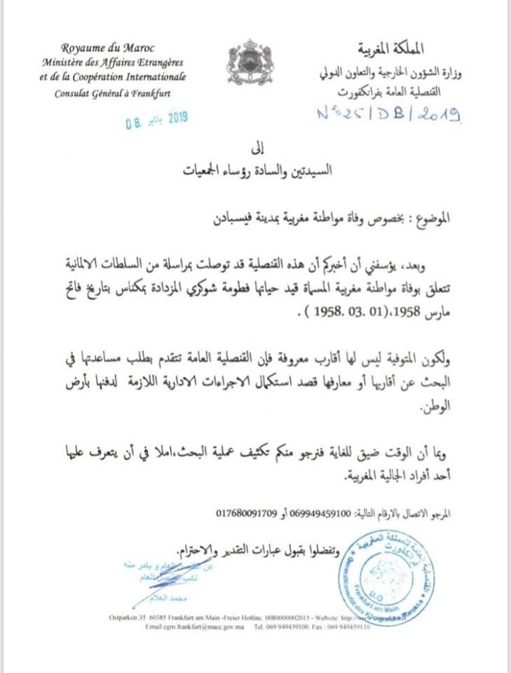 و قالت القنصلية العامة المغربية بفرانكفورت، في مراسلة موجهة إلى رؤساء الجمعيات المغربية التي تنشط بألمانيا ، أنه “لكون المتوفاة ليس لها أقارب معروفة، فإن القنصلية العامة تتقدم بطلب مساعدتها في البحث عن أقاربها أو معارفها، قصد استكمال الإجراءات الإدارية اللازمة لدفنها بأرض الوطن”.