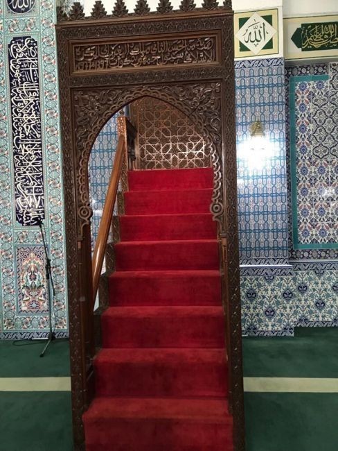 على المنبر نقرأ: "هدية الملك الحسن الثاني ، ملك المغرب ، في المركز الإسلامي في سيول ، كوريا الجنوبية - 1397/1977".